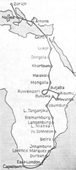 "Although, on the surface, there was nothing spectacular about this flight," the editors of Flight wrote in 1927, "it has been, nevertheless, a splendid performance."4  The flight made Mittelholzer famous and attracted the attention of Baron Louis von Rothschild who, in 1929, engaged Mittelholzer to fly him to Nairobi for a hunting expedition, which paid for Mittelholzer's flight over Kilimanjaro.