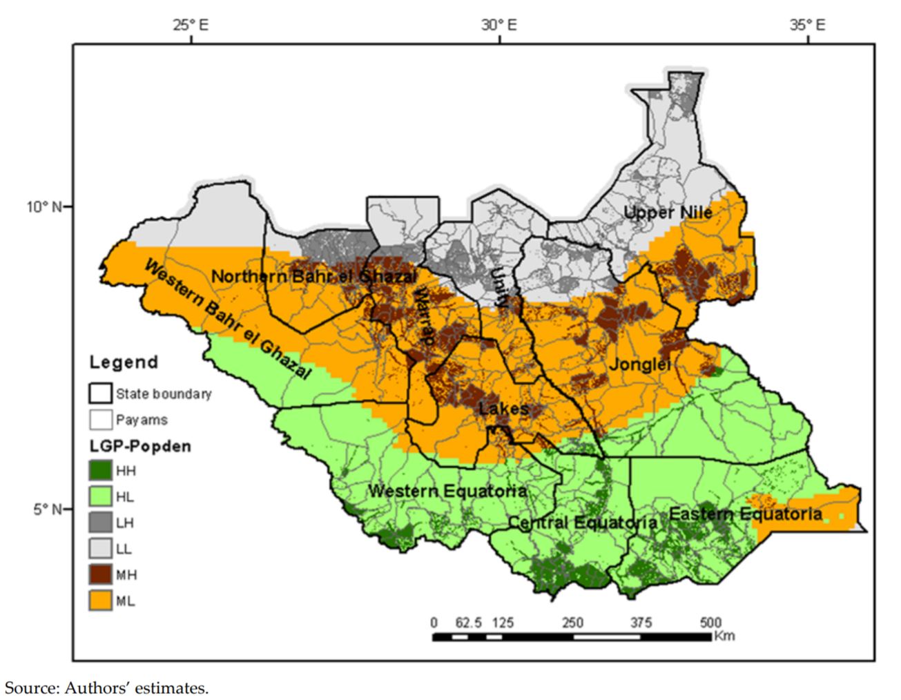 So what does it mean then to say that about 70 percent of South Sudan is “suitable for agriculture”? Could Diao be saying that South Sudan’s land is underutilized and crop development schemes can be set up just any place? Apparently not. Diao used this figure as a starting point for a lesson about the need to relate the suitability for agriculture to human geography. Diao laid population densities over length of growing period (or, agricultural potential) to reveal those places where high (LGP > 220) or medium (LGP 180-220) “agricultural potential” overlapped with population densities of more than fifty people per square kilometer. You need labor to farm, after all. These areas, she suggested, would be best suited to intensive farming development. Her conclusions are modest: areas with more than 50 people per square kilometer and high or medium “agricultural potential” account for 4.8% and 7.8% of South Sudan’s land area—or just about 12 % of South Sudan in total.